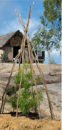В год посадки высота саженца туи сорта Смарагд равнялась 80 см. Для защиты посаженного саженца вокруг него устанавливают ограждение из шестов. Длина шеста — 1,5 м, шесты ставят по кругу, диаметр которого равен 1 м, и связывают на расстоянии примерно 10 см от конца, как показано на рисунке.